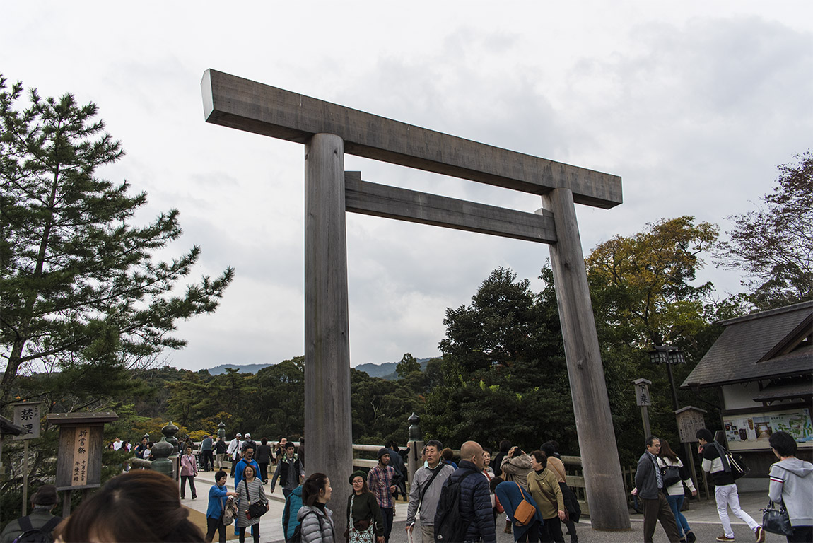 | 清流・五十鈴川に架かる宇治橋、人の住む俗界と神の暮らす聖地の架け橋である。 この鳥居の柱は遷宮前に外宮御正殿の棟持柱であったものがリサイクルされ使用されている。次の遷宮時、この鳥居の柱は桑名宿の鳥居に生まれ変わる。用材を無駄にしないシステムが確立されている。 |