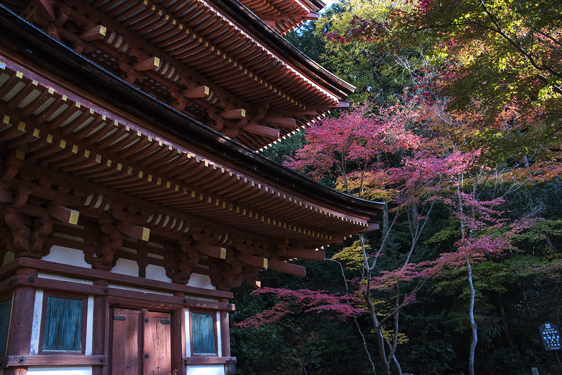 | この三重塔は1442年の建立とされている。平成15年に修理、内部壁画も修復され、外観が鮮やかになりました。 周りのモミジの紅葉はこれからでした。 |