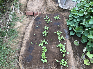 4月:トウモロコシの育苗、3月中旬の低温で発芽が1週間程度遅れ、移植は昨年より10日ほど遅れた。2本苗で移植し、活着後1本にする方法とした。他野菜の畝づくり、植え付け実施した。